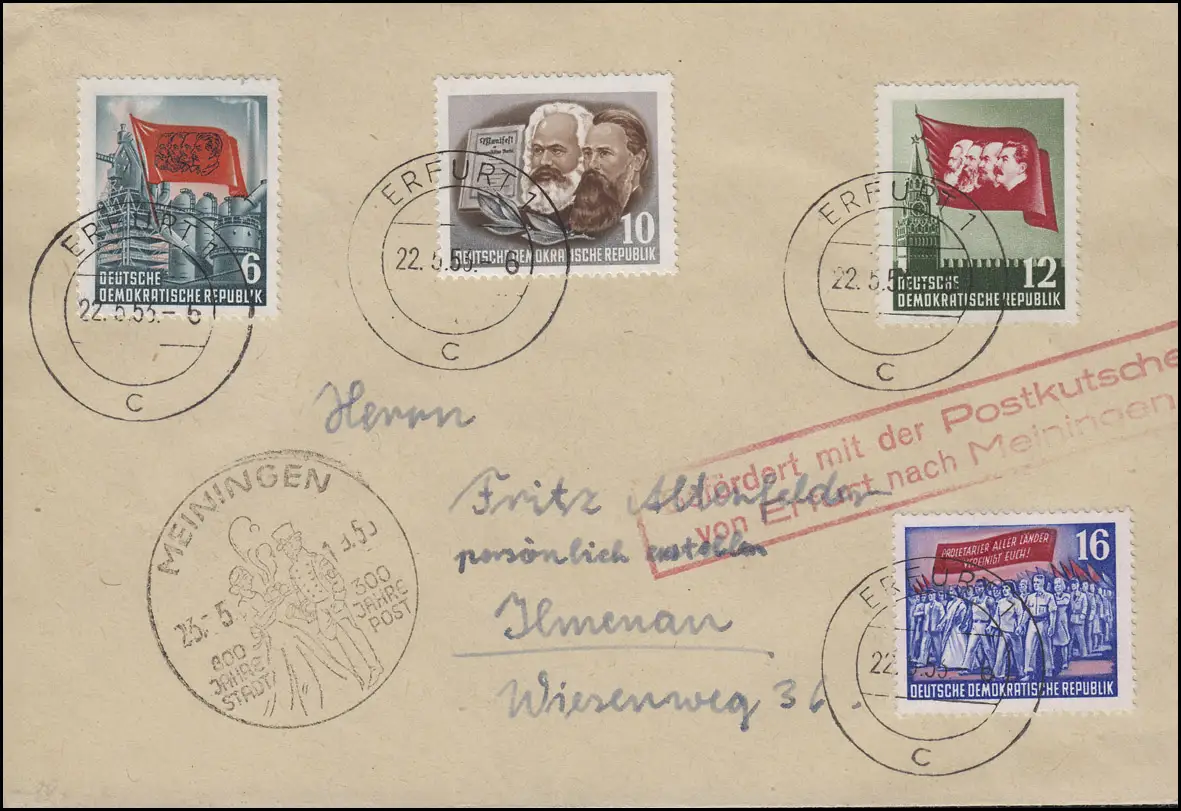 DDR Postkuchen-Post Erfurt-Meiningen Bf.Erfur t 22.5.53 / SSt Meiningen 23.5.52