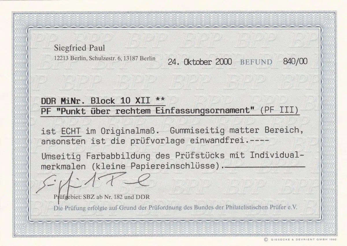 DDR: numéro de code 10 XII, frais, résultat BPP