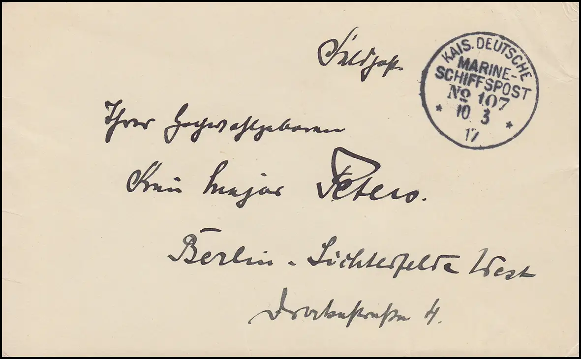 NAVIRE MARINE FRANÇAIS POST No 107 - 10.3.1917 SMS Derfflinger sur lettre de poste