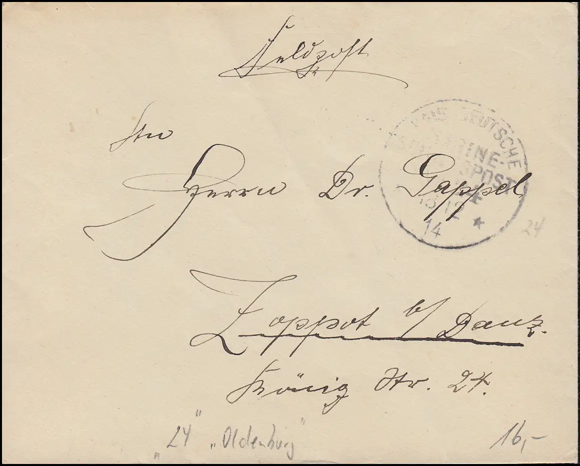 NAVIRE MARINE FRANÇAIS POST No 24 - 18.12.1914 SMS Oldenburg comme lettre de poste de terrain