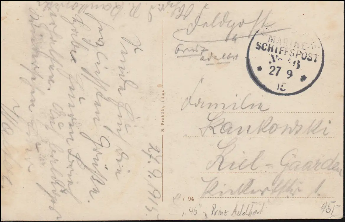NAVIRE MARINE FRANÇAIS POST No 46 - 27.9.1915 SMS Prince Adelbert Feldpost-AK