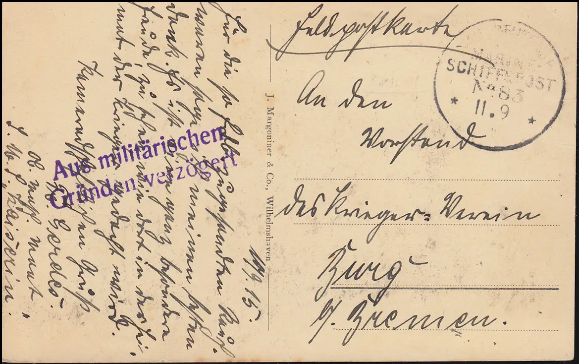 Avec "Beizeiler" retardé pour des raisons militaires sur la carte de vue "Wilhelmshaven - Kaiserliche Werft" à Burg près de Brême. Examen: original Référence de l'article: 00000000031048>Note: Cet article n'est disponible qu'une seule fois. Vous recevrez exactement l ' article représenté.