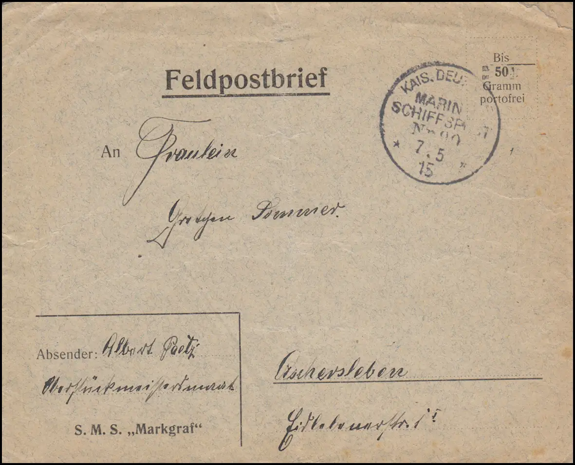 NAVIRE MARINE FRANÇAIS POST No 90 - 7.5.15 sur lettre de champ-post à Oschersleben