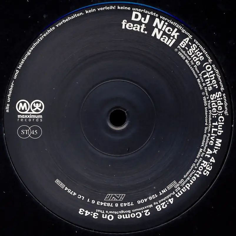 12" Maxi DJ Nick feat. Nail - Randy II Let's Do It Again, couverture neutre, état plaque M-; Fabriqué en Germany 1995 Maxximum Records 7243 8 78343 6 1, Tracks [Club Mix] 4:35, [Live At Rotterdam] 428, Come On 3:43