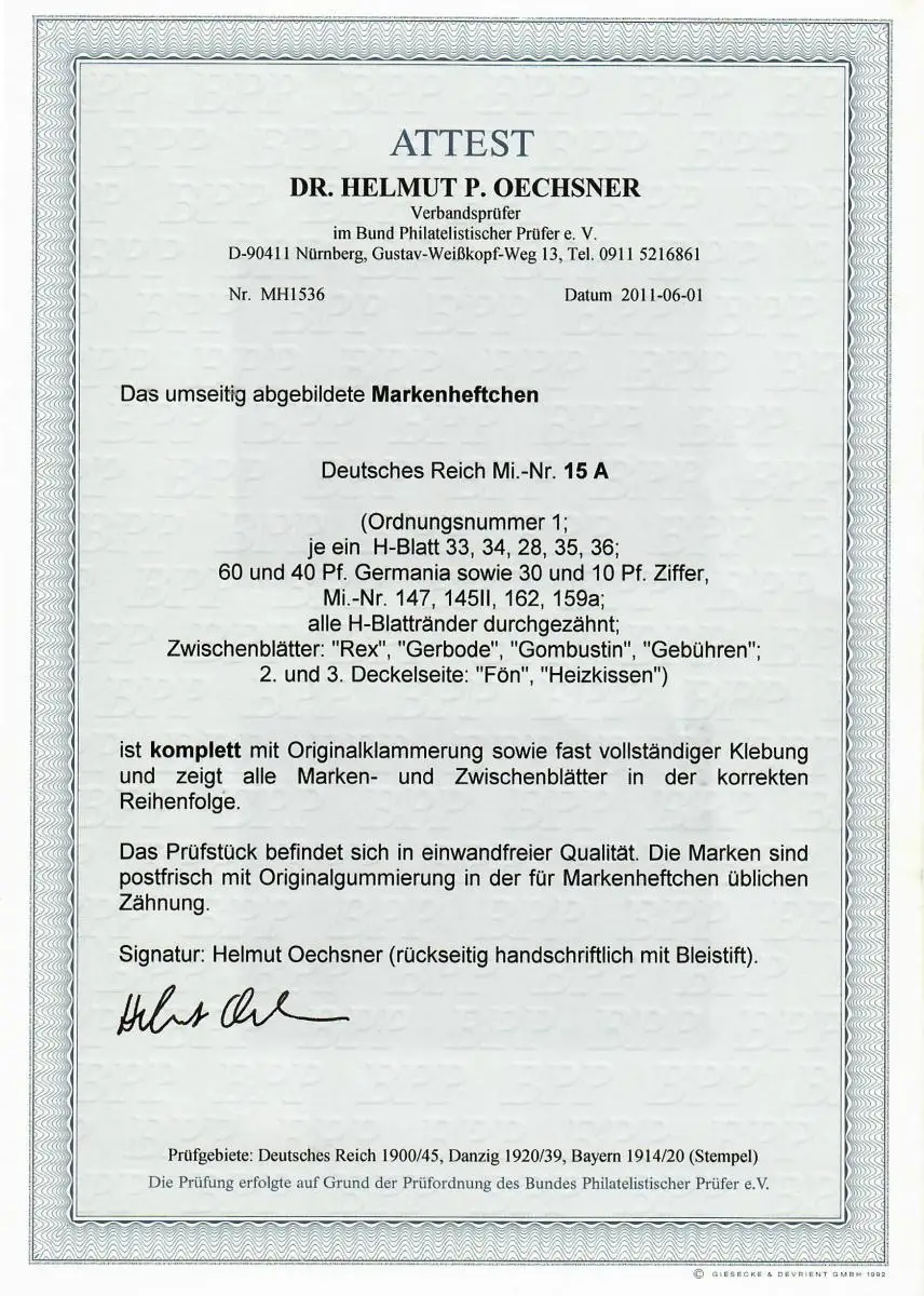 DR: Carnets de marques Mi Nr. 15 A, complet, frais, impeccable, BPP Attest