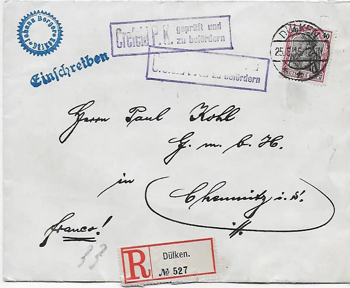 DR: Enregistrer Dülken selon Chemnitz, 1915 avec censure Crefeld