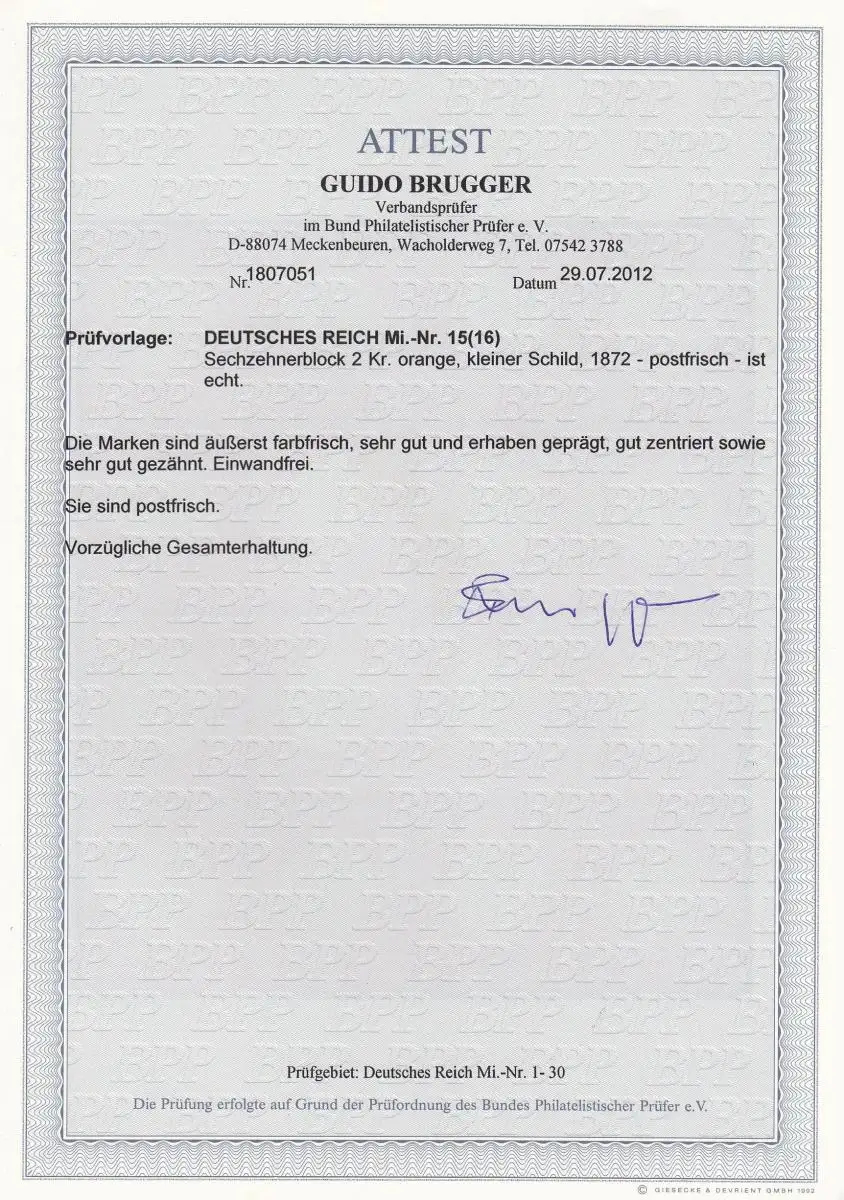 DR: Min. 15, bloc de seizièmes frais post-frais, couleur fraîche, impeccable, BPP Attest