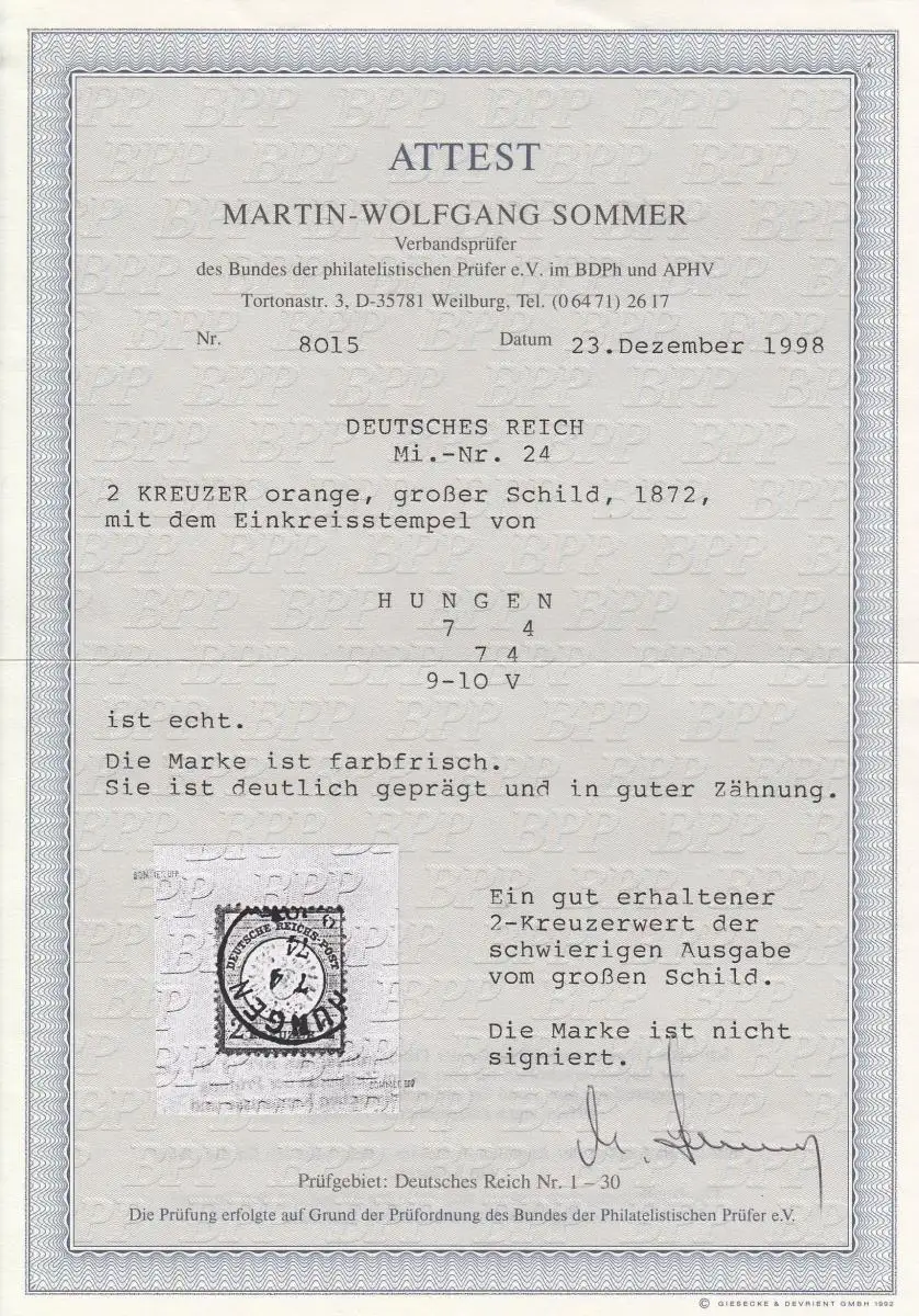 DR: Min. 24, cacheté Hungen, 1874, BPP Attest