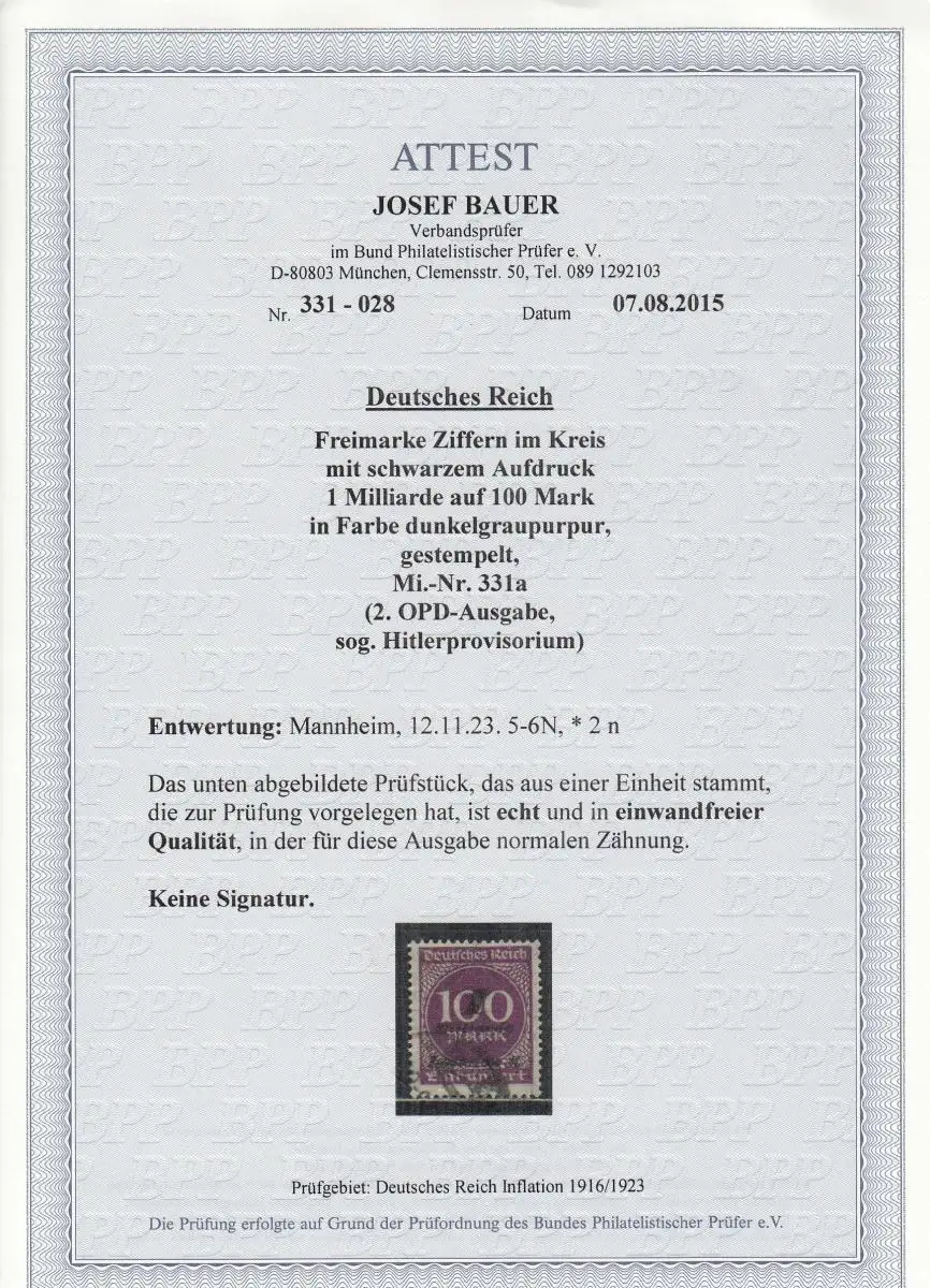 DR: Min. 331a, dit Hitlerprovisorium, stampé Mannheim, BPP Attest