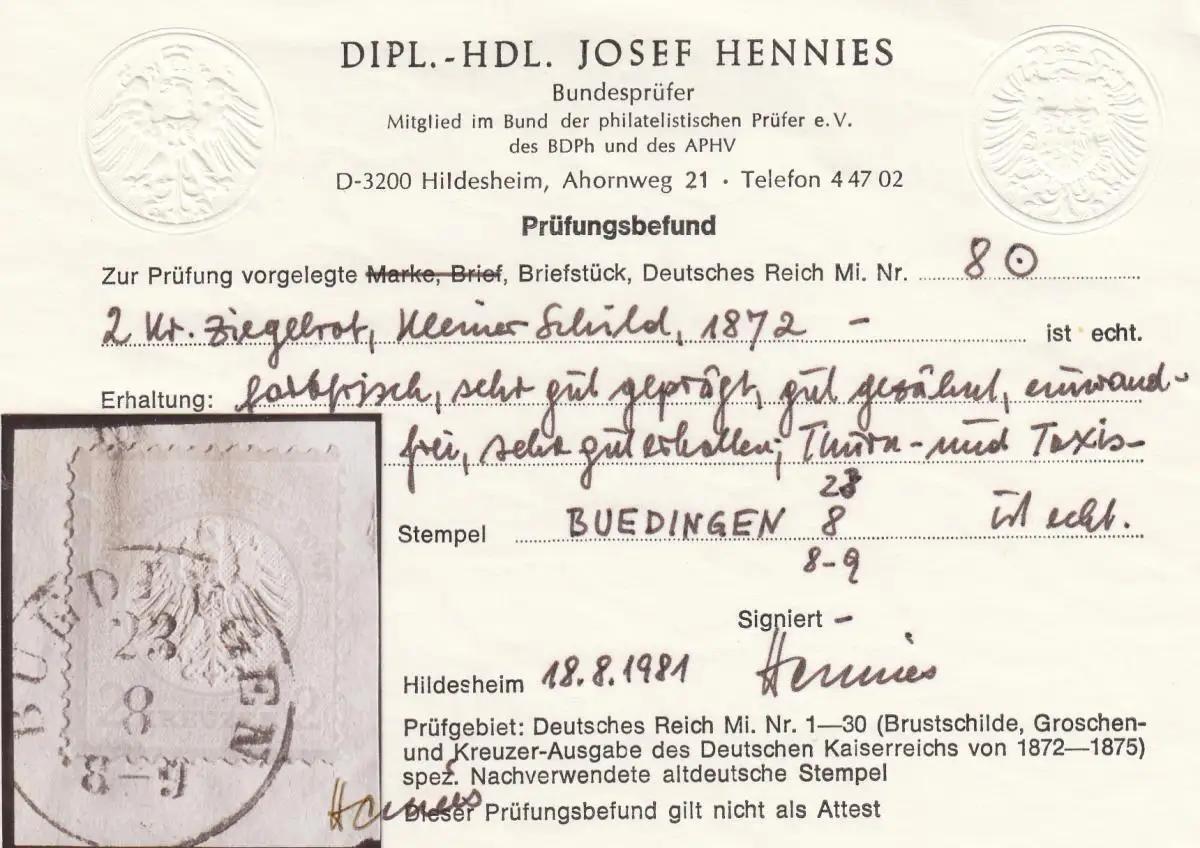 DR: Min. 8, cacheté pièce-lettre, Thurn &Taxis Büdingen, BPP résultat