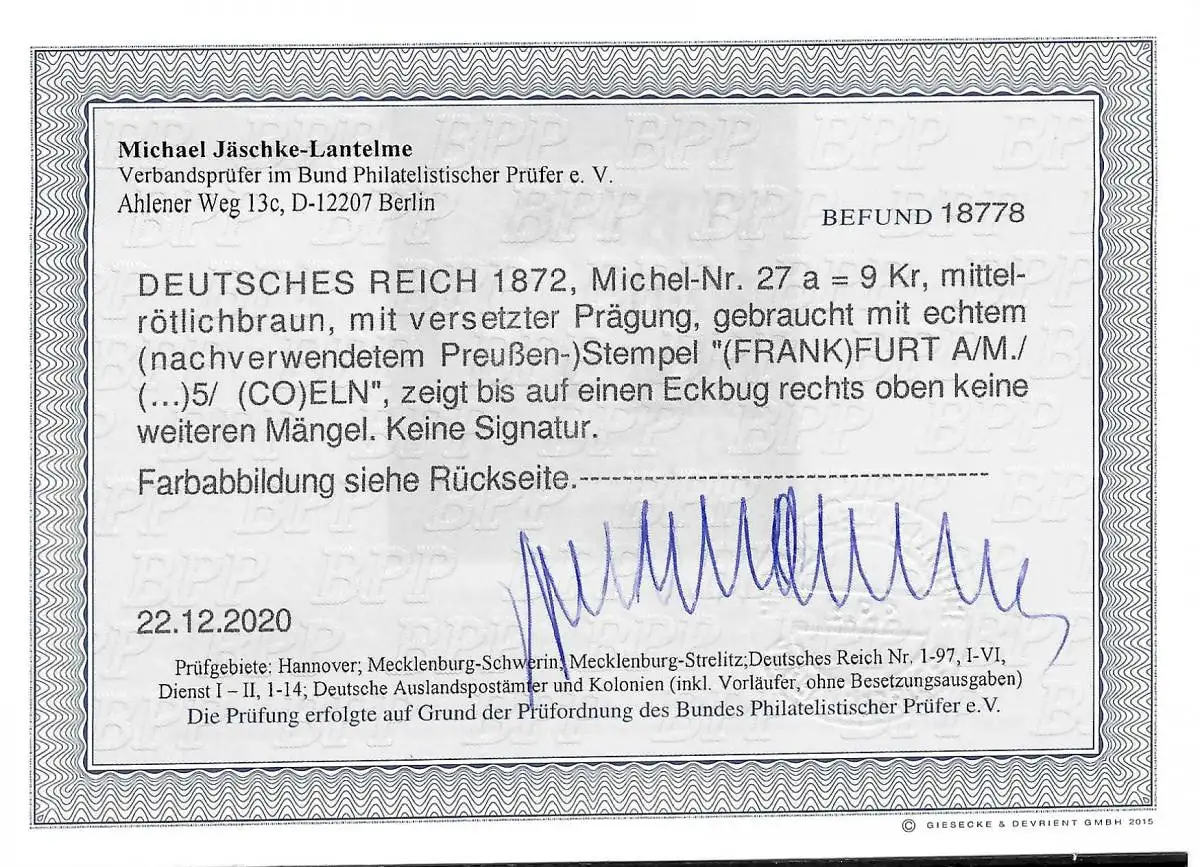 DR: Tamponné au numéro 27a, Bahnpost Frankfurt-Köln, gravé, résultat BPP