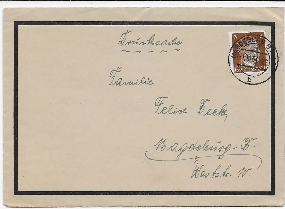 DR: Lettre de deuil Chose imprimée Lettre locale Magdeburg: Erreur de cachet en 1954, contenu
