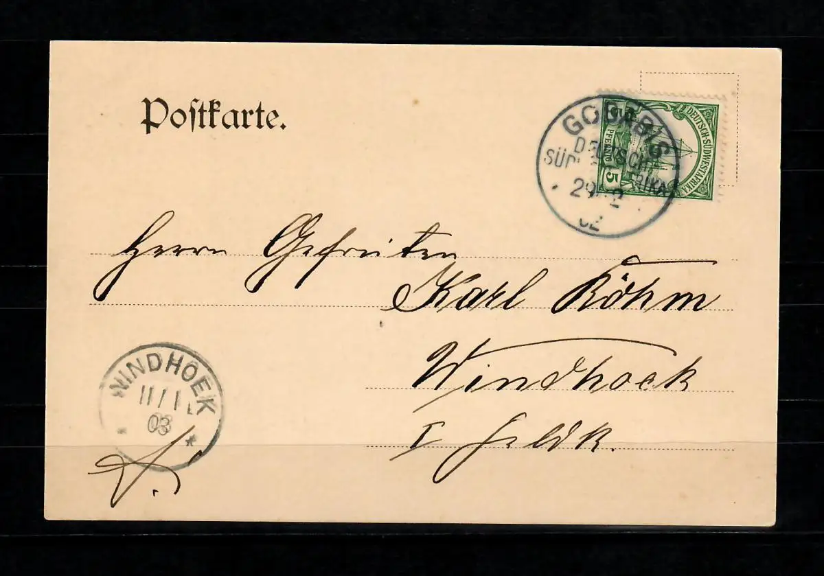 Voir Scan: 29.12.02: Carte de la caserne d'artillerie à Windhoek, écrite à Bechuanaland au point d 'eau Sandfonone près d ’ Olifantsk [loof) par le service de gestion des entrepôts de l & #39;expédition frontière allemande-anglaise, le soldat Richard Weber à Windhoec avec l'information: N'ai plus de timbres. Artn.: 5002017 Test: original Numéro d\'article: 00000005002018