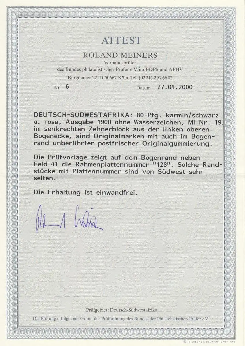 DSWA: Min. 19, Eckrand 10 bloc avec plaque numéro 128, frais de port, BPP Attest