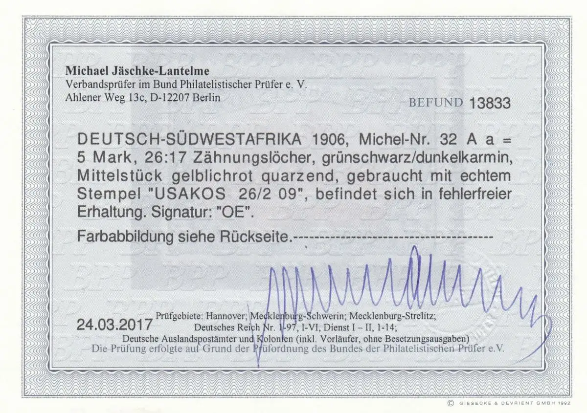 DSWA: Min° 32 A a, cachet Usakos, BPP résultat