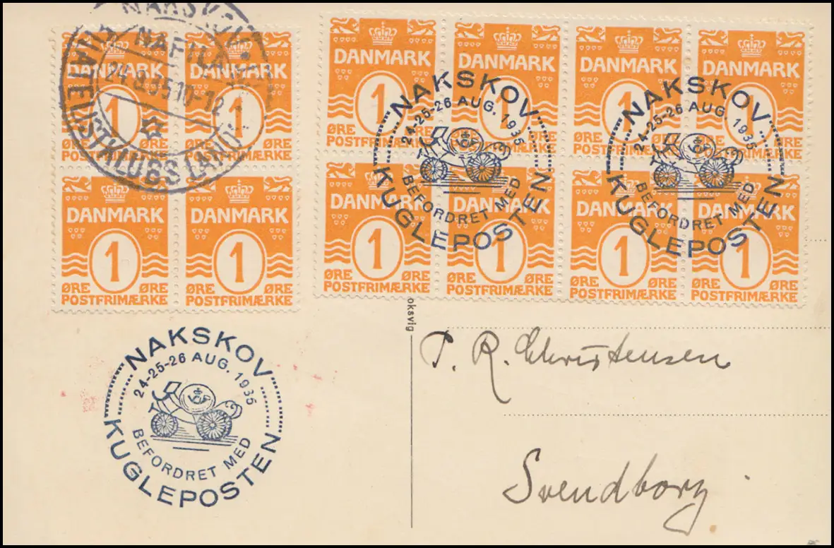Carte de vision HURTIGT OG SIKERT avec deux timbres spéciaux NAKSKOV NAFILA 24.8.35 et NakSKov KUGLEPOSTEN 24-25.-26.8.1935, transportés par diligence (appelée "Bullette") vers Svendborg Numéro de catalogue: 77 Examen: original Numéro d'article: 00000000031294