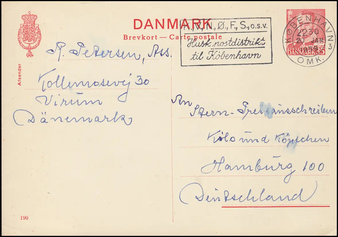 Danemark Carte postale P 244 Frederik IX. 35 Öre, Kz. 190, Kobenhavn 20.1.1959