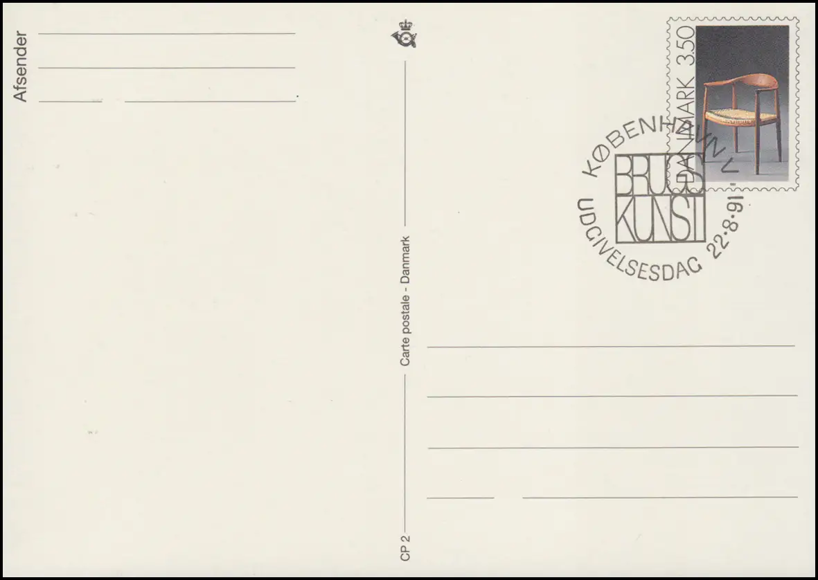 Danemark Carte postale P 283 chaise 3,50 couronnes Kz. CP 2, ESSt COPENHAGEN 22.8.1991