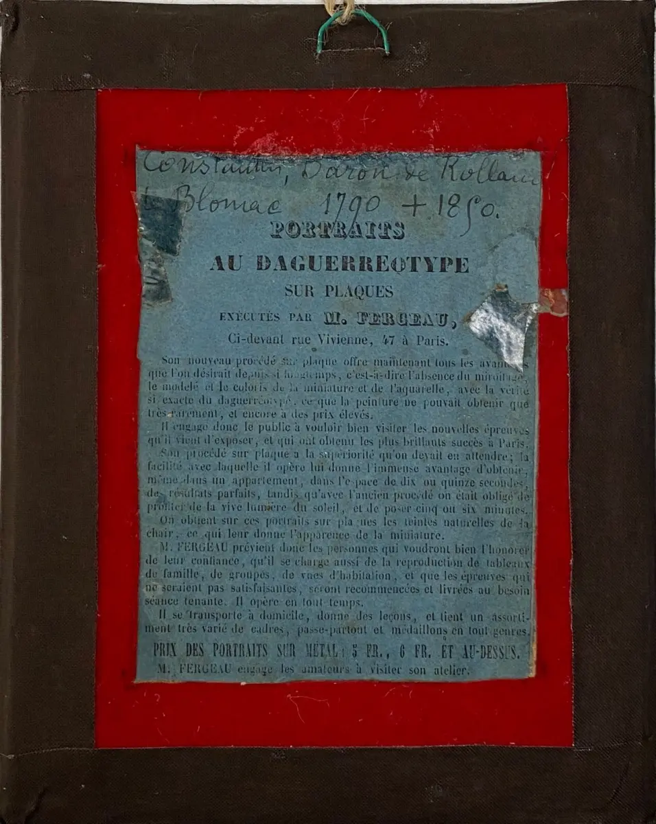 Daguerréotype de beau format : demi-plaque. Portrait de Constantin de Rolland de Blomac, né le 20 mai 1790 à Marseille et mort à Carcasonne le 20 mai 1850, par Charles Fergeau (1815-1877) daguerréotypiste au 47 rue Vivienne au Palais-Royal, Paris, adresse très prisée des professionnels.