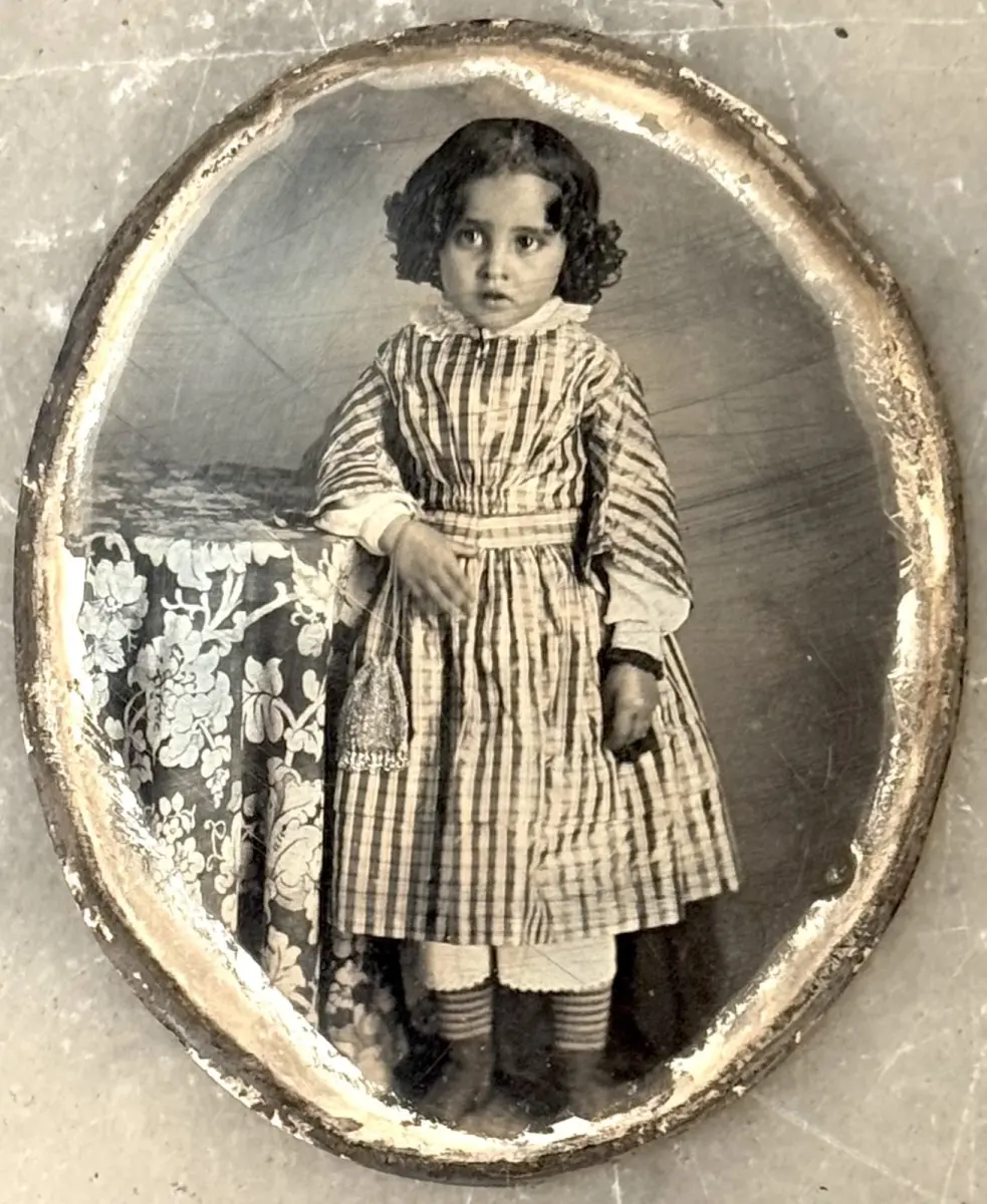 Daguerréotype finement colorisé d'une enfant en pied accoudée à un guéridon recouvert de tissu damassé.