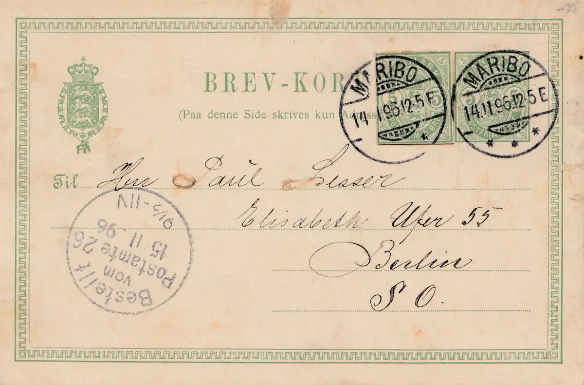 Danemark: 1896 Tout le dossier de Maribo à Berlin