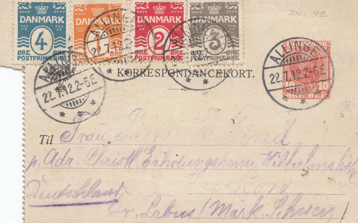 Danemark: 1912: tout le courrier de carte Allingen vers l'Allemagne