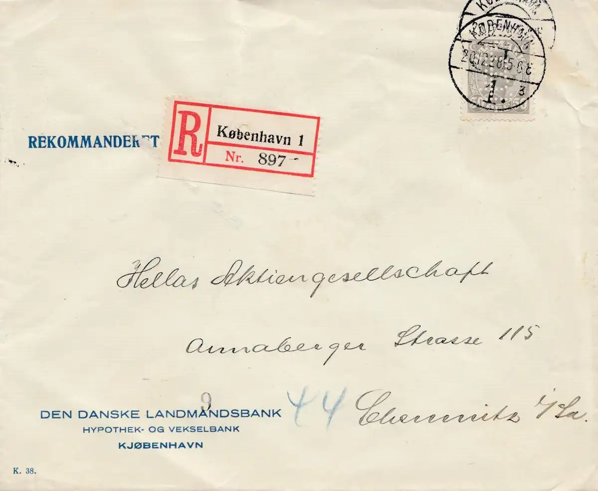 Danemark: 1928: recommandé Copenhague à Chemnitz; Perfin