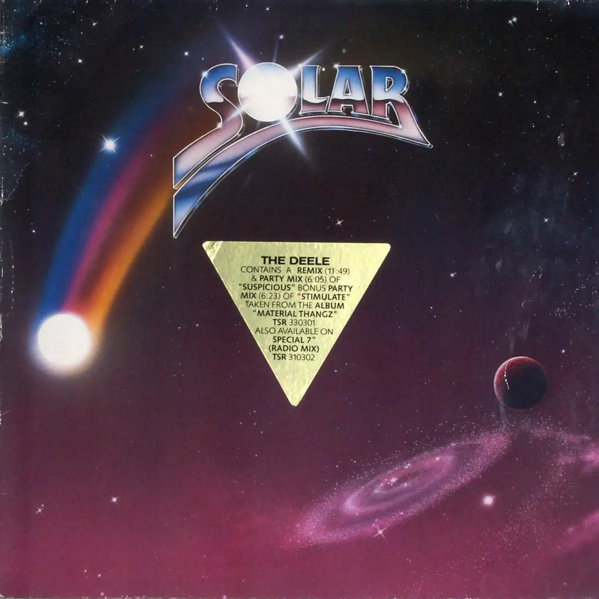 12" Maxi The Deele - Suspicious, unité de la société de disques avec autocollant, état plaque VG+ coque VD+; Fabriqué en Allemagne 1985 Solar TSR 320302, pistes [RMX] 11:49, [Party Mix] 6:05, Stimulate [Parti Mix) 6h23