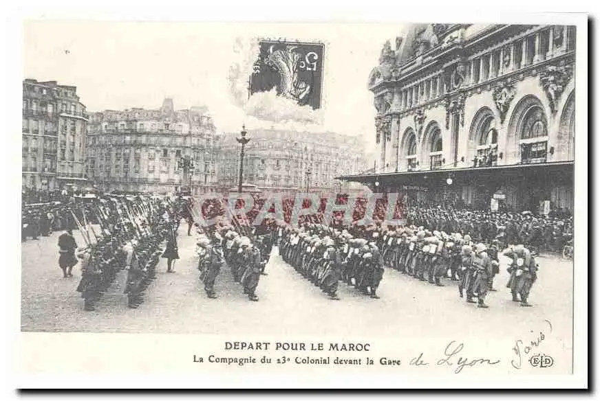 Depart pour le MAroc Cartes postales La compagnie du 23 colonial devant la gare (reproduction)