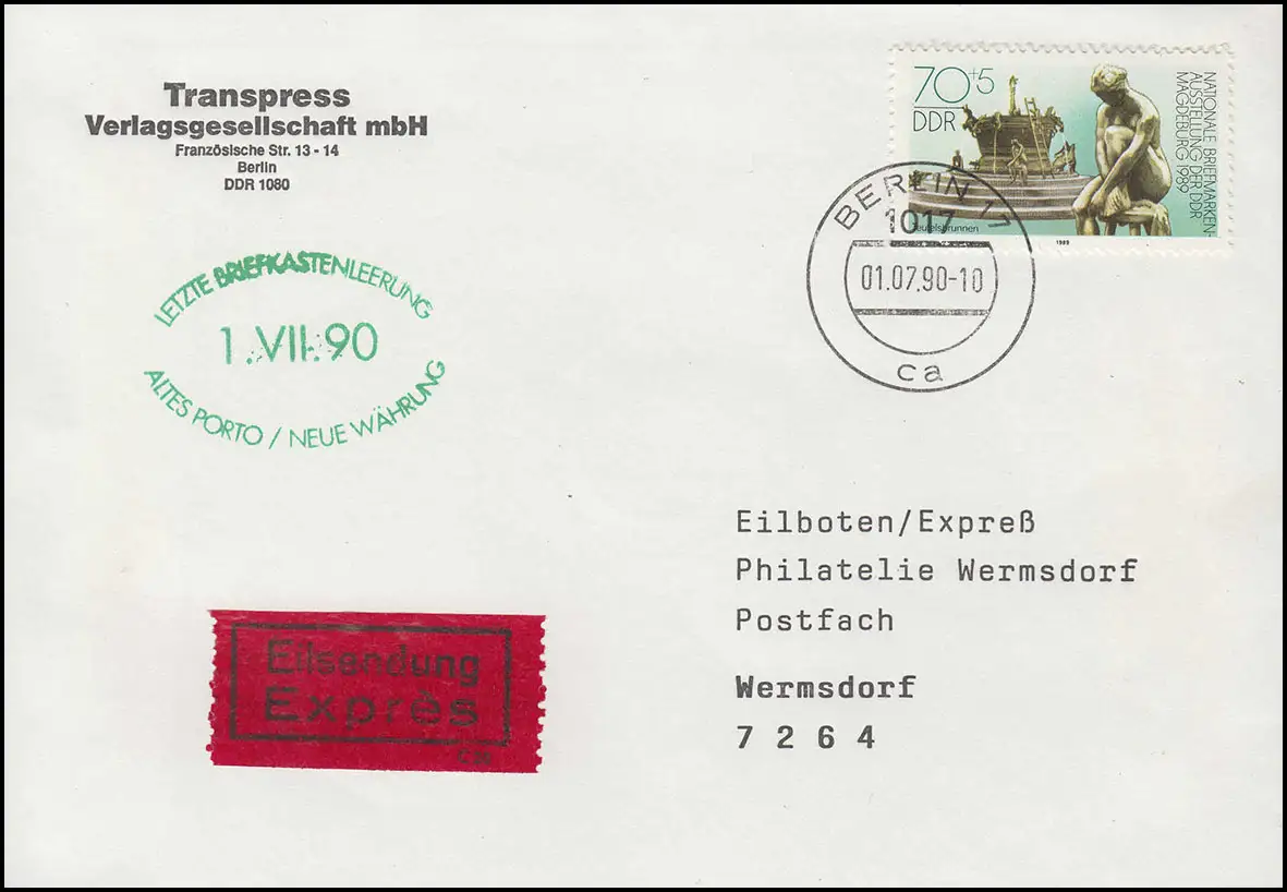 cachet vert "Dernière boîte aux lettres ..." sur envoi express, cachet d'arrivée WERMSDORF 2.7.90 Numéro de catalogue: 3266 Vérification: original Référence produit: 00000000035501>p>Remarque: Cet article n'est disponible qu'une seule fois. Vous recevrez exactement l'article représenté.