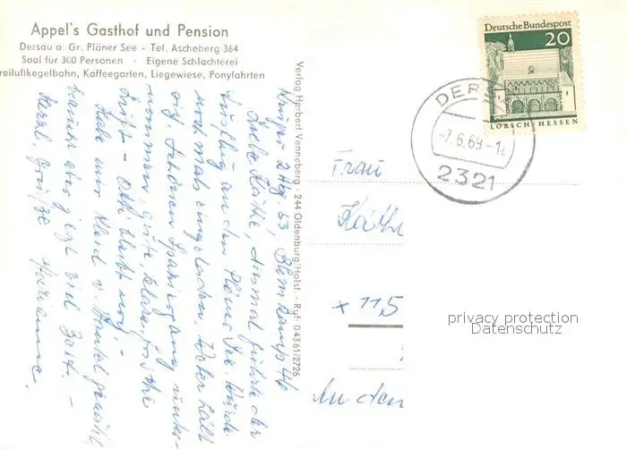 Dersau Appels Gasthof Motorboot Saal Strand Gaststube Kaffeegarten Panorama Dersau postalisch gelaufen 1969 Erhaltung siehe scans [WerneD78] WernPID7