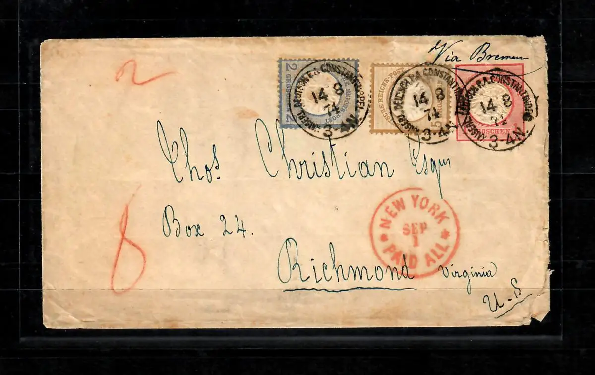 Voir Scan: 1872 Enveloppe complète 1 et 5 gr. Grand pectoral, décoration 3 couleurs Frankatur. Constantinople 14.8.74 Poste allemande sur Varna-Donau, via Bremen avec Lloyd "Oder" nord-allemand par New York à Richmond. Malgré les traces de transport, un précédent très rare lettre de demande de DP Turquie. Lettre double poids avec 1 1/2 gr . Porto 2 1/2 Gr. par unité de poids. Seuls quatre enveloppes GS de grand pectorium utilisé à Constantinopel et seulement trois lettres transatlantiques expédiées d'Allemagne vers les États-Unis. ArtN°: 5002009 Test: original Numéro d 'article: 00000005002009