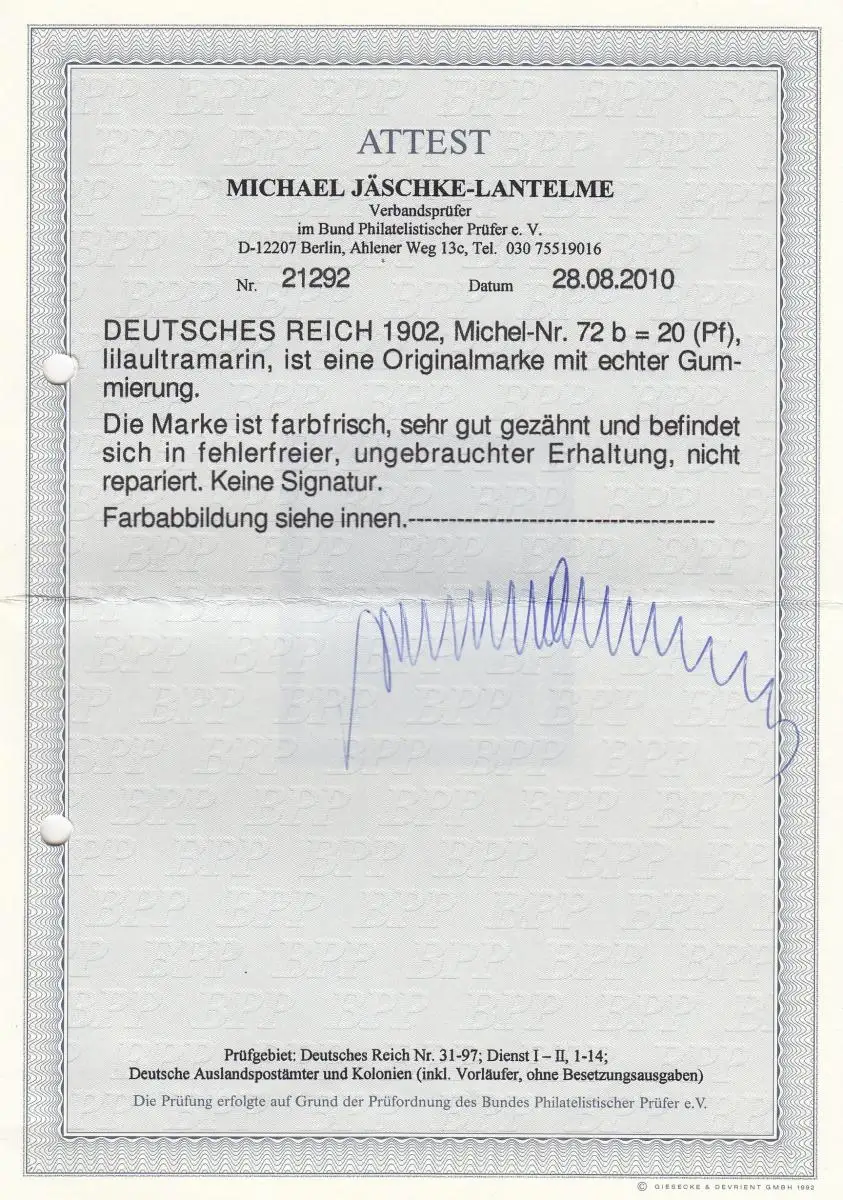 Reich allemand 1902: Min. 72b, caoutchouc original, *, BPP Attest