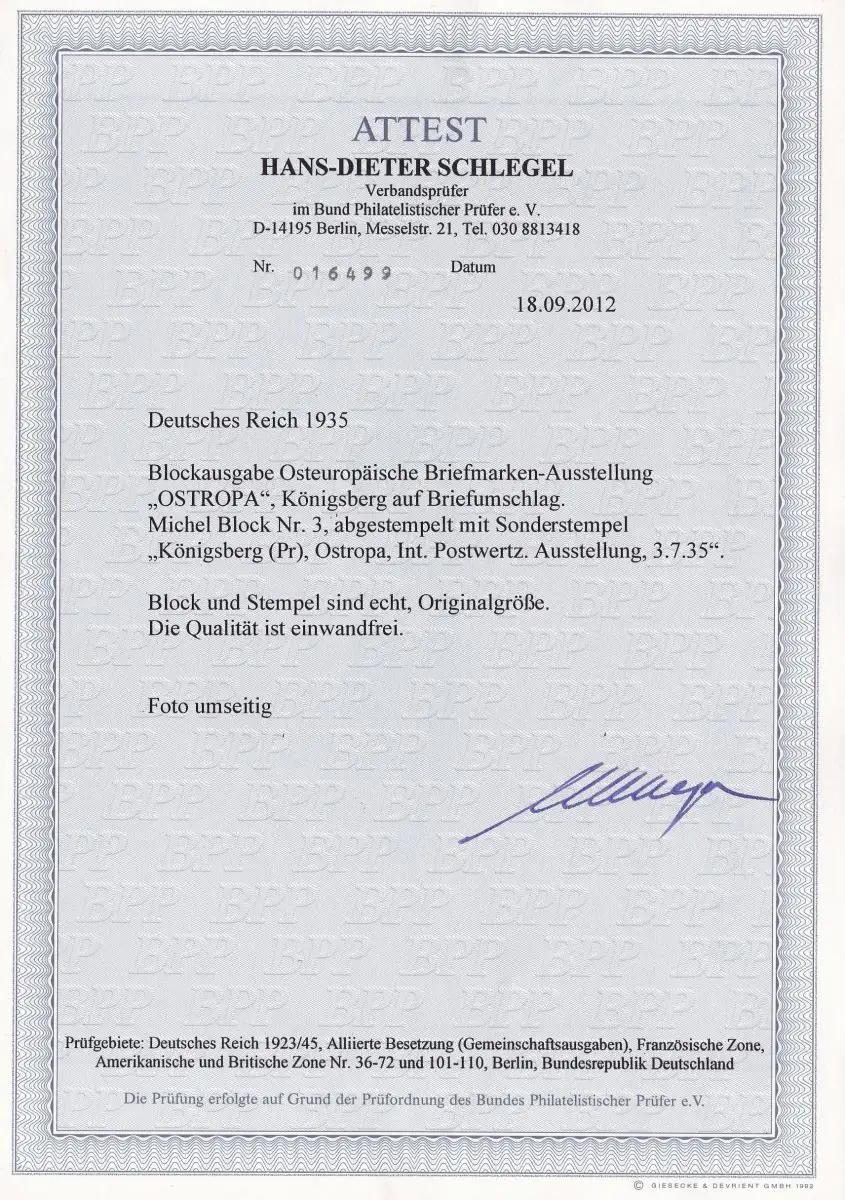 Reich allemand - Block 3, timbre spécial Ostropa 1935, BPP Attest