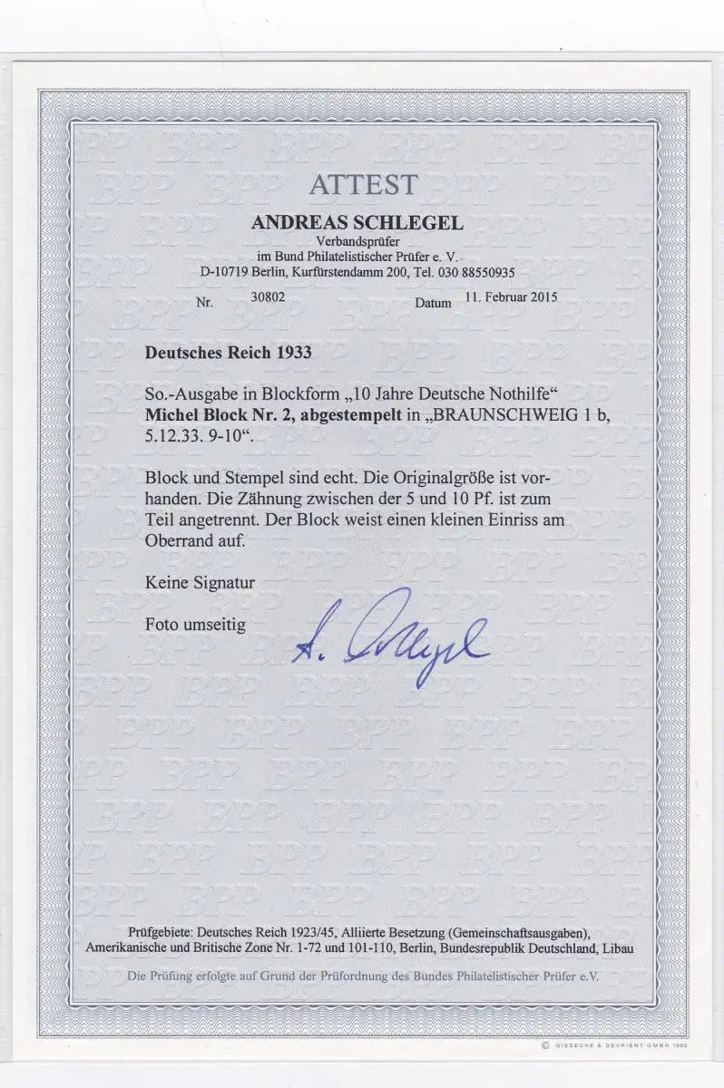 Reich allemand: bloc n° 2 Aide d'urgence, tamponné Braunschweig, BPP Attest