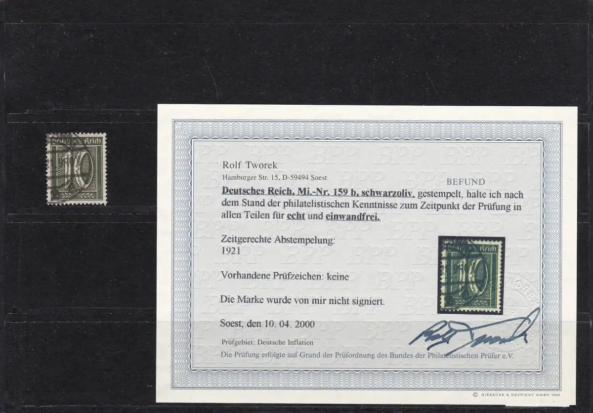 Reich allemand: Min. 159 b, 1921 cacheté, BPP résultat