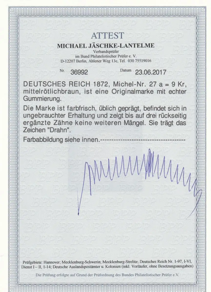 Reich allemand: MiNr. 27a, Falz, BPP Attest