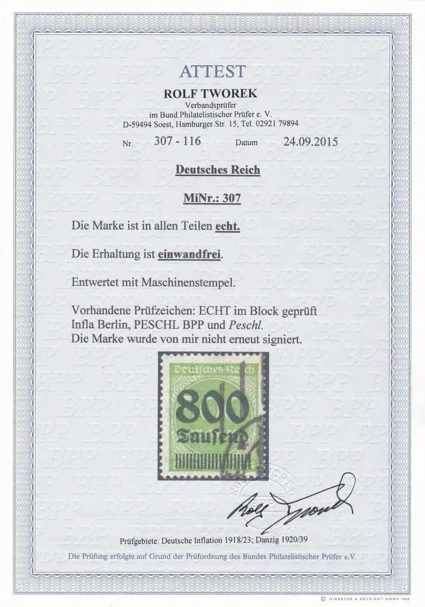 Reich allemand: MiNr. 307, cacheté, BPP Foto Attest