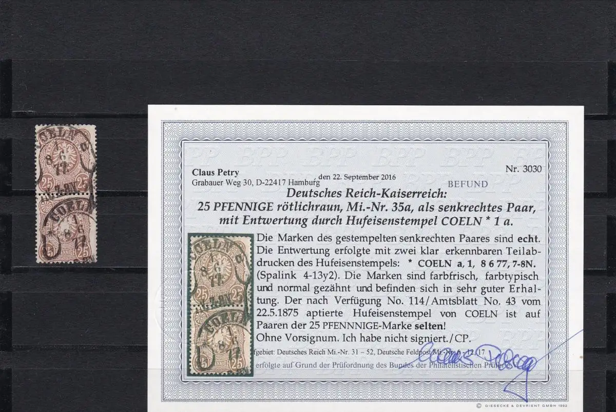 Reich allemand: Min. 35a, couple senk., Tampon de fer à cheval Coeln, BPP résultat