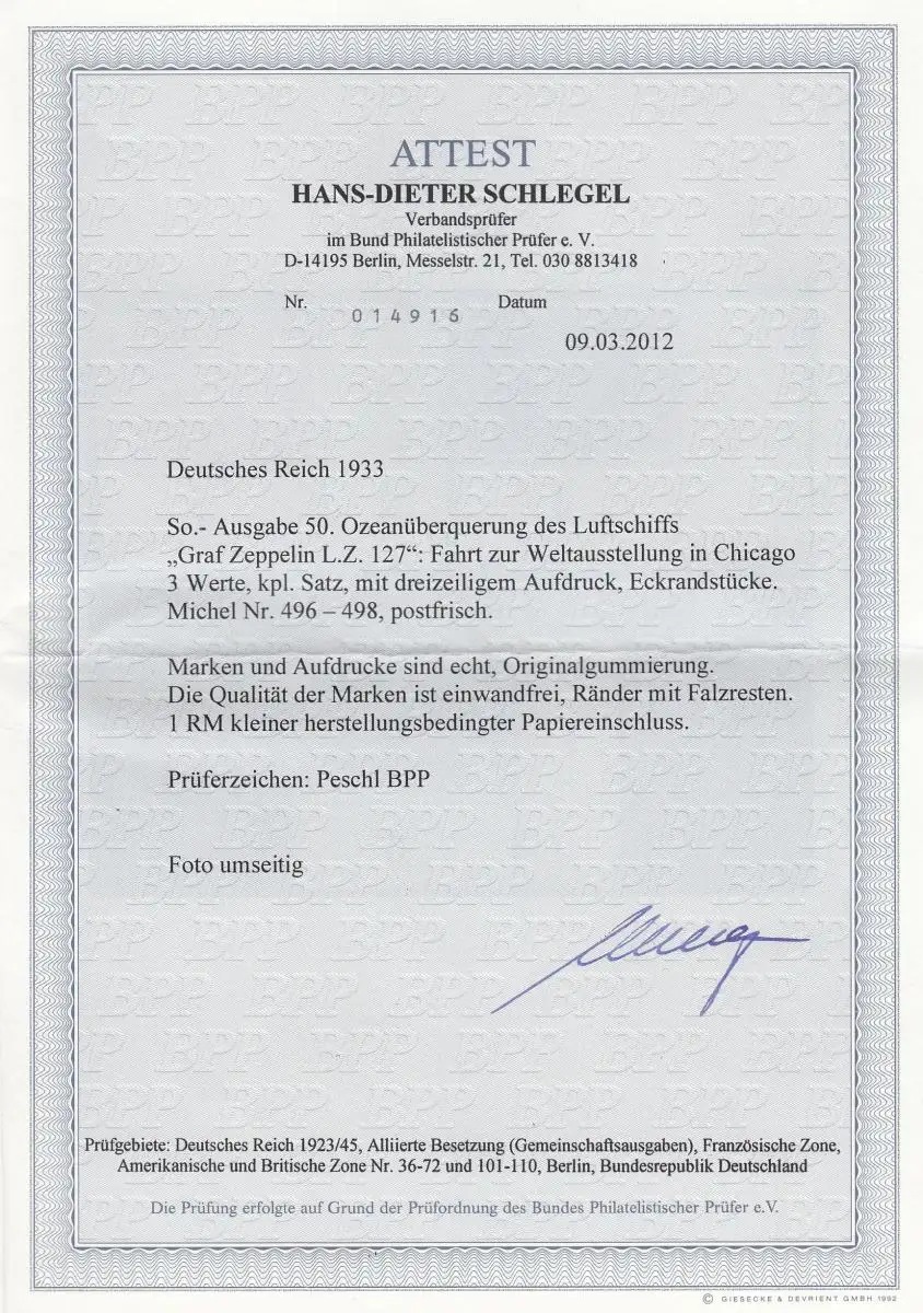 Reich allemand: MiNr. 496-498, frais de port Eckrand avec BPP Attest