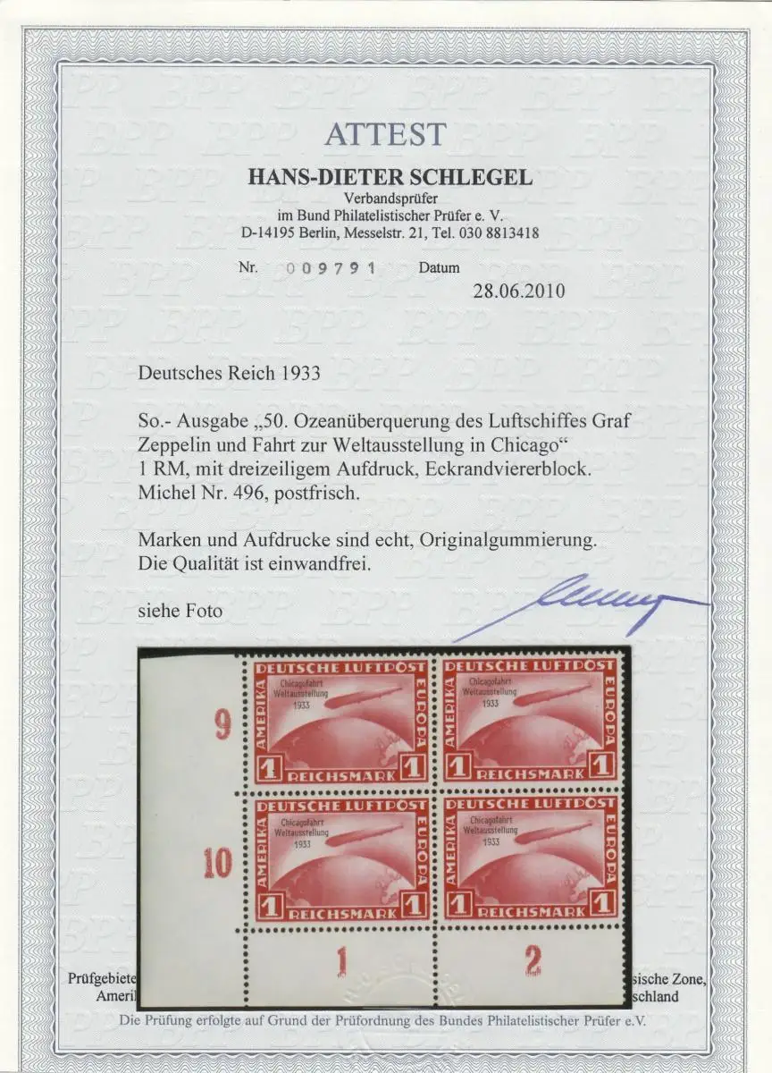 Reich allemand, Min. 496, Chicago, post-freeich, Eckrand Quaerblock, BPP Attest