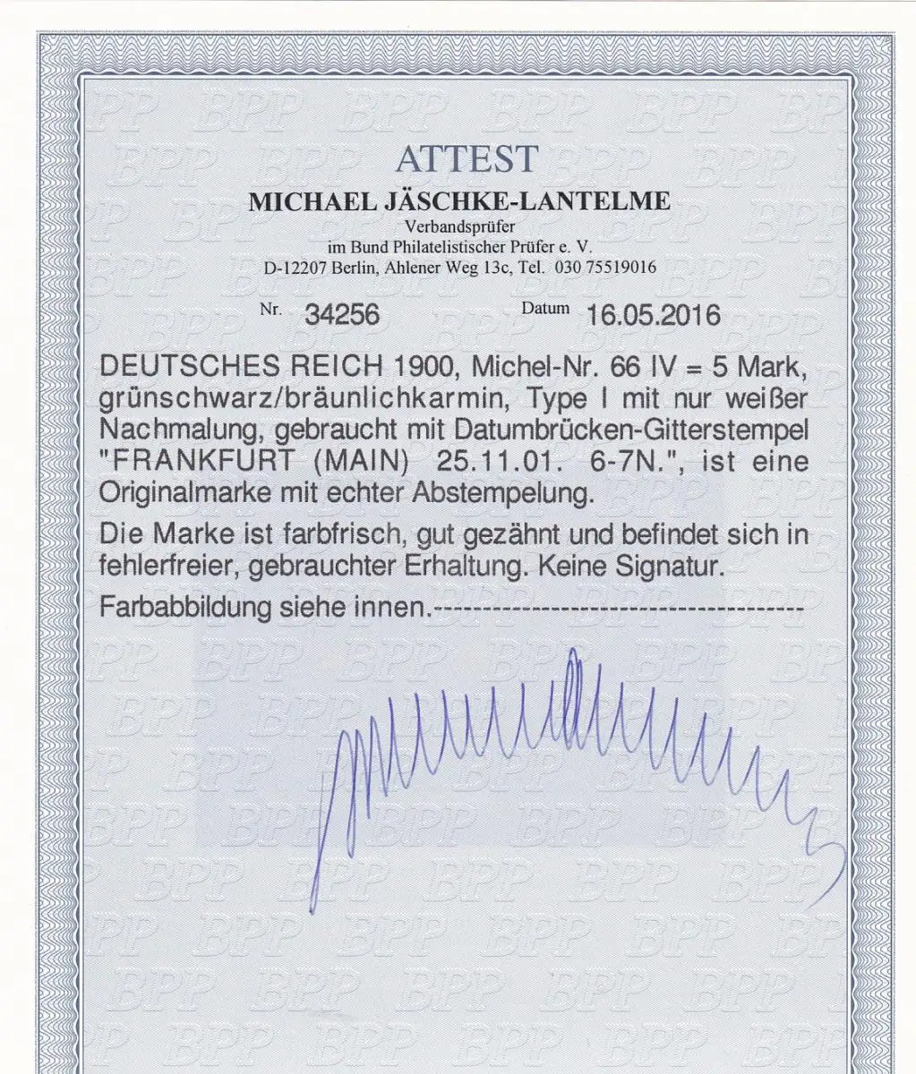 Reich allemand: Min. 66 IV, cacheté Francfort 1901, BPP Attest