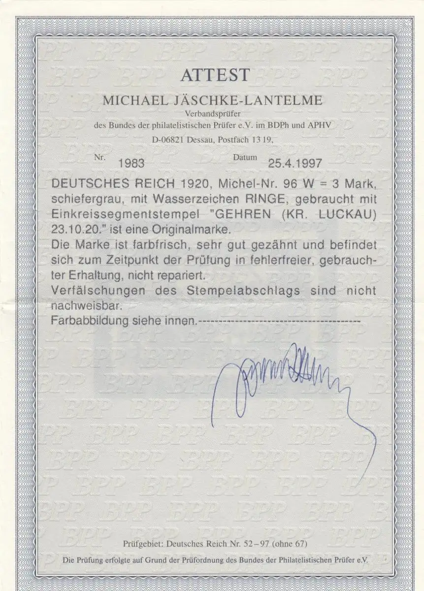 Reich allemand: MiNr: 96 W, Stamp Gehren, BPP Attest