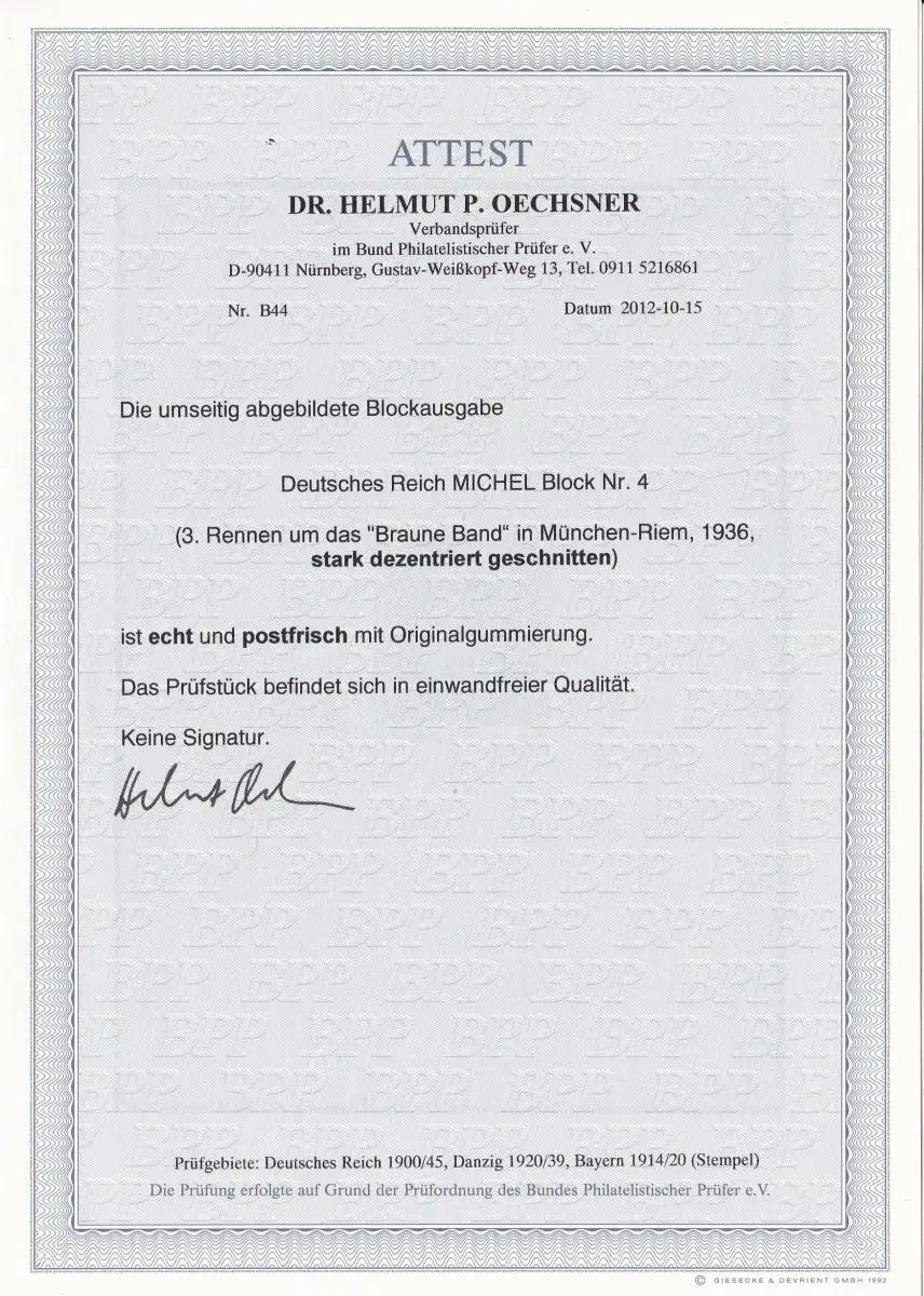 Reich allemand: MiNr. Block 4, **, Denschänkung, BPP Foto Attest