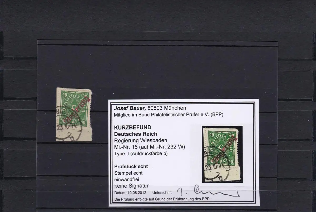 Reich allemand: gouvernement Wiesbaden,MiN° 16, Type II,b, cacheté, BPP résultat