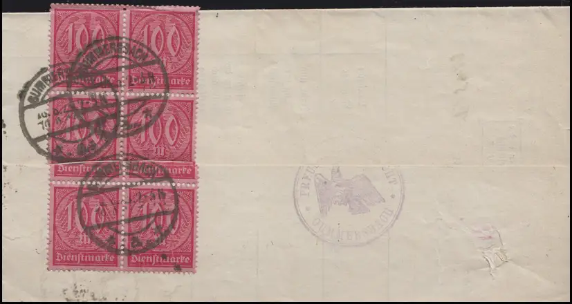 Bloc de 10 collé au-dessus du bord du courrier et utilisé comme timbre: Pour ouvrir le timbre, les marques sont coupées.