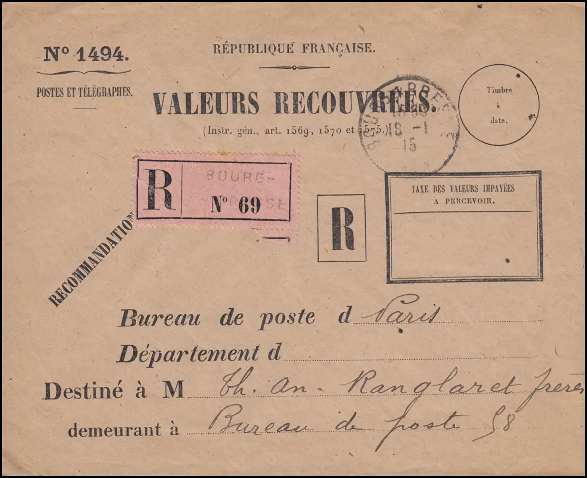 Lettre de service VALEURS RECOUVRES en tant que lettre R Not-R-Zettel BOURG-EN-BRESSE 18.1.15
