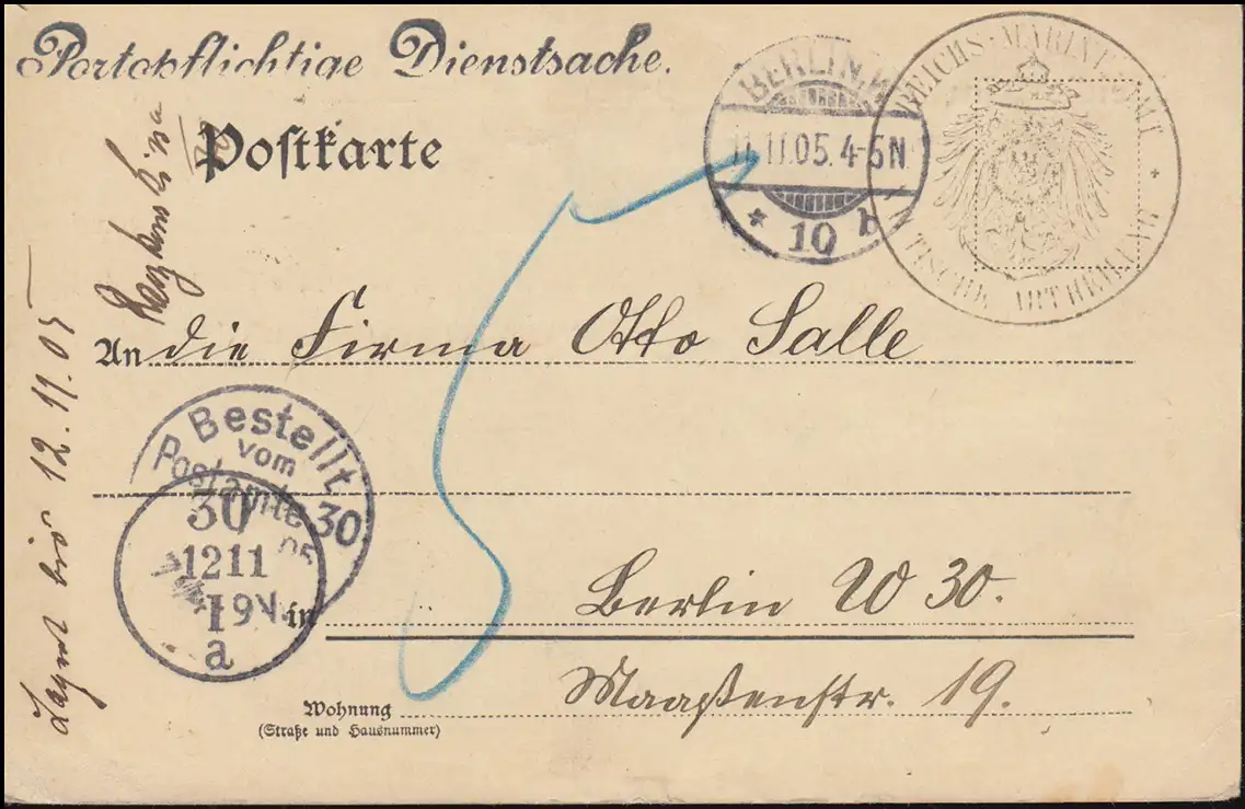 Affaire de service du Reichs Marine en carte postale locale BERLIN 11.11.1905