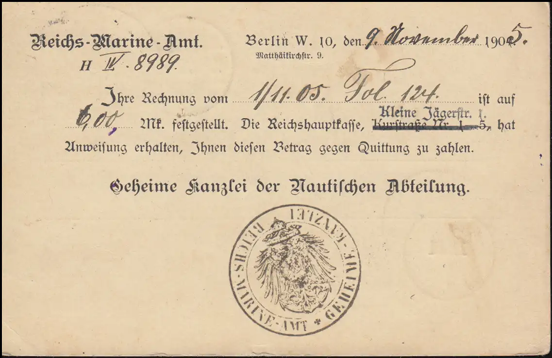 Carte postale de formulaire " Greffe secrète du département nautique ," timbre Reichs-Marineamt Greffier secret, affaire de service / postporto, à la société Otto Salle, timbre d'arrivée 12.11.1905 Vérification: original Référence de l'article: 00000000028132>p>Remarque: Cet article n'est disponible qu'une fois. Vous recevrez l ' article représenté avec précision.
