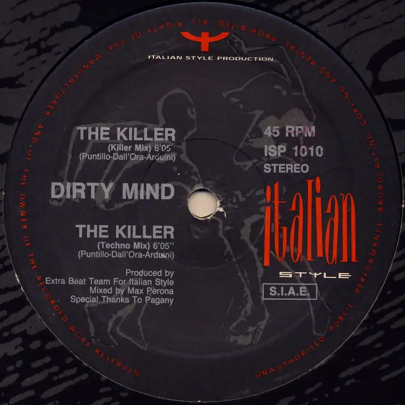 12" Maxi Dirty Mind - The Killer, Unitcover der Disque Company, État Platte VG+ Hülle VD+; Fabriqué en Italie 1990 Italian Style Production ISP 1010, Tracks [Killer Mix] 6:05, [Techno Mix) 6h05